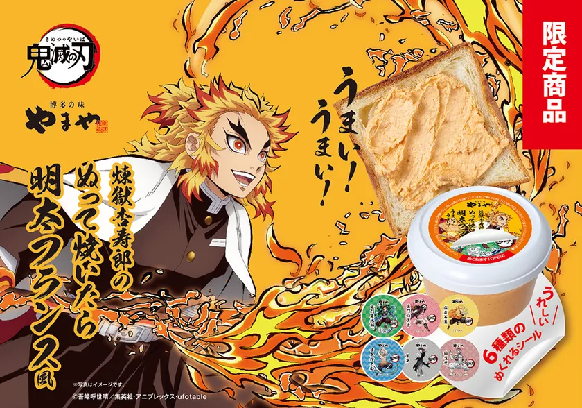株式会社やまやコミュニケーションズ(本社:福岡市東区、代表取締役社長:山本 正秀)は、アニメ「鬼滅の刃」のキャラクターシール付きコラボ商品「煉獄杏寿郎のぬって焼いたら明太フランス風」を2022年5月1日(日)より発売いたします。