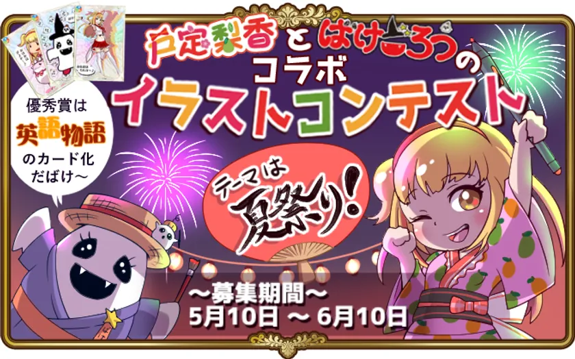 戸定梨香とばけごろうをあるテーマでイラストを描いていただきます。『英語物語』のチームがいただいた作品にコメントさせていただくと同時に、カード化に選ばれた作品はゲーム内のカードデザインに採用させていただきます。