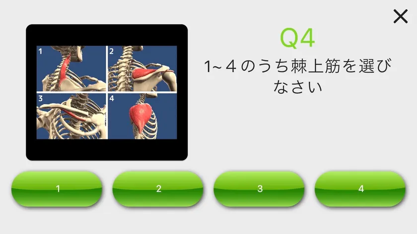 人体解剖アプリ:筋肉と骨以外の初学者にはまだ必要の無い情報が多い。テスト機能がないため記憶の定着には不向き。