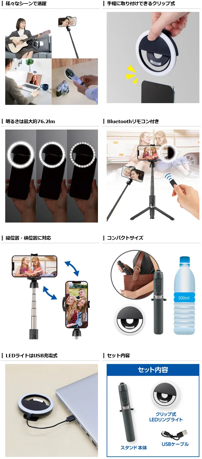 スマホに挟んで明るく照らせるLEDリングライトと、軽くてスタイリッシュなスタンド型セルフィースティックの便利なセットです。