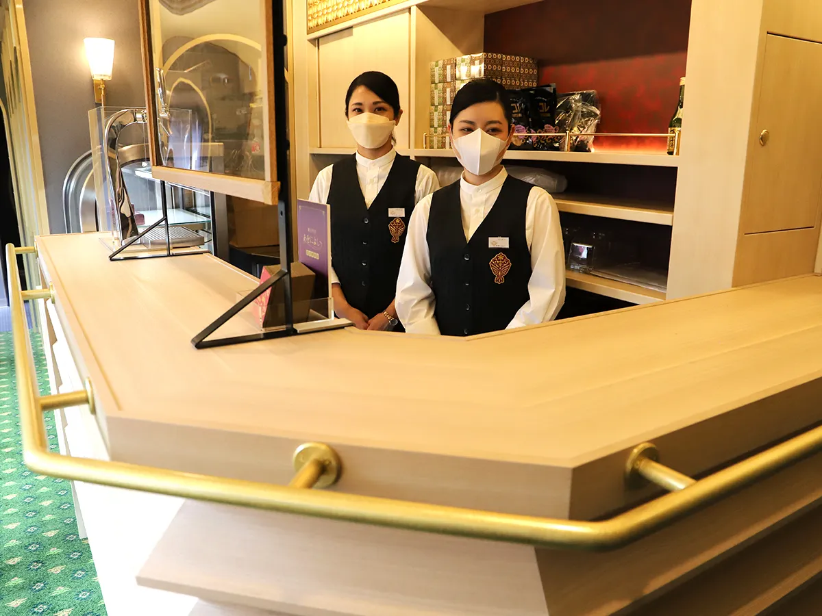販売カウンターでは、シェラトン都ホテル大阪特製 車内販売限定スイーツ「あをによしバターサンド(レーズン&マロン)」(コーヒーまたは紅茶付き)1,000円などのスイーツや、大和醸造クラフトビール(生)600円、大和醸造クラフトビール(瓶)各650円、季節のジュース300円、プレミアムトマトジュース300円などをご用意しています。「あをによし」グッズとして、オリジナル和ハンカチ(車内販売限定)500円、オリジナルキーホルダー800円、オリジナルフェイスタオル1,000円、クリアファイル(2枚セット)800円も販売します。