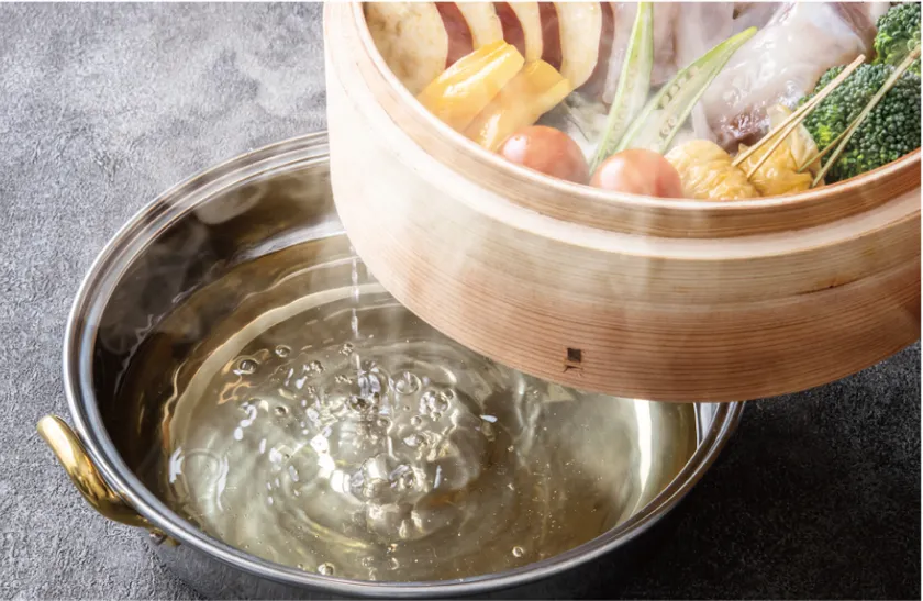 蒸籠から湧き出る黄金色ふぐスープ