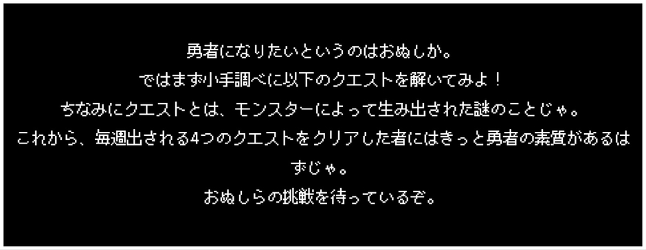 配布物に書かれた二次元コードを読み取ると、そこには謎(クエスト)が出現中! 突如出現したクエストは、一体何なのか。新作イベントとどう関係しているのか。謎は深まるばかり…。