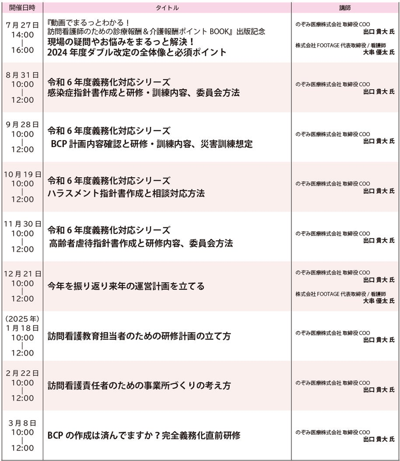 令和6年度になり義務化研修や報酬改定がスタートしましたが、『日々の運営で分からない事が出てきて質問がしたい』『法制度に関しては動画だけだとやっぱり不安…』といった事を感じている方も多いのではないでしょうか?そんな方のために今押さえておきたい研修を契約施設の皆様は毎月無料で受講できます。