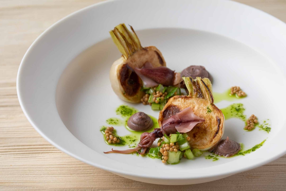 やわらかな春カブと、春に旬を迎えるホタルイカの前菜です。カブは、昆布出汁とあわせて真空調理した後、香ばしく焼き上げています。それに、燻製をしたホタルイカと、ソース状にしたホタルイカのブーダンノワール(フランス料理で、豚肉の血と脂で作られる腸詰めの一種)を合わせます。このソースは、ホタルイカを醤油麹でマリネし、香草やラードと混ぜ合わせ、肝まで味わえるように仕立てています。昆布出汁を含んだ、甘くてジューシーなカブが、ホタルイカの濃厚な味わいを際立たせます。付け合わせとして、カブの葉と「たまり漬けマスタード」を和えたサラダを添えています。