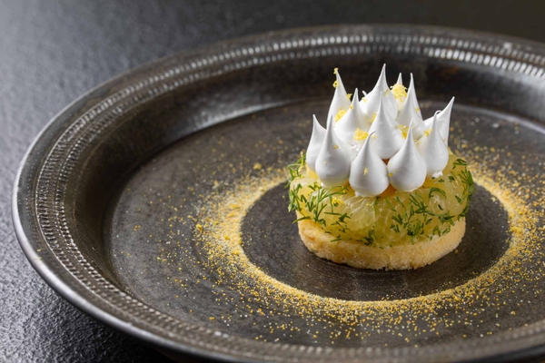 上品な甘さと酸味が特徴の柑橘「文旦」と、春が旬のフレッシュな酸味を持つ「シェーブルチーズ」のアイスクリームを合わせたデザートです。ディルでマリネをした果肉に、文旦の果汁を使ったケーキやメレンゲ、文旦の皮をすりおろした文旦ゼスト(フランス料理で、柑橘の皮をすりおろしたものを意味する)やパウダーを使い、仕立てています。