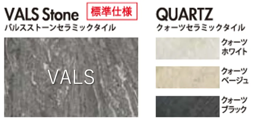 スイス・アルプスの希少高級石バルスストーンの風合いを再現したタイルを壁面・床面の全面に採用。色褪せない高級感が浴室を落ち着きある寛ぎの空間へ昇華させます。お好みに応じ、QUARTZタイル3種もお選びいただきけます。