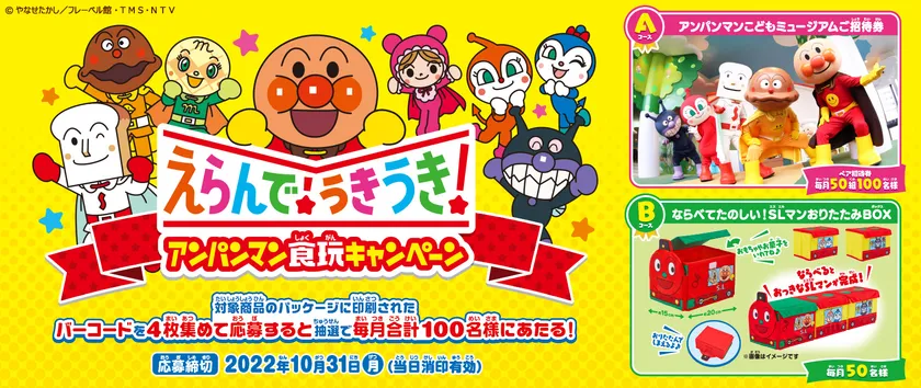アンパンマン食玩対象商品より応募できる『えらんで!うきうき!アンパンマン食玩キャンペーン』を実施します。対象商品のパッケージに印刷されたバーコードを4枚集めて応募すると、抽選で毎月合計100名様に素敵な賞品が当たります。「Aコース:アンパンマンこどもミュージアムご招待券」(毎月50組100名様)「Bコース:ならべてたのしい!SLマンおりたたみBOX」(50名様)応募用紙1枚につき、どちらか1コースのみご応募可能です。