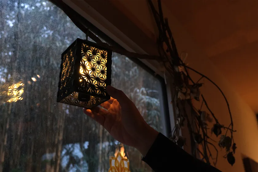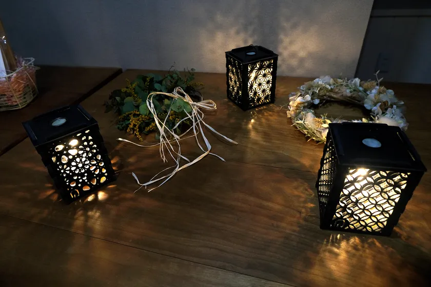 ブラックキューブは、和柄文様から漏れ出る光の陰影美が最も美しく浮き出るように何度も試作を重ねて薄型の特殊な硬質ポリエチレンフォーム素材を採用しました。触った感じは表面がコンクリートブロックのような石っぽいザラザラした感じの新感覚にちょっとした驚きがあるかと思います。これにより光と影の陰影がくっきりと現れ非常に綺麗です。