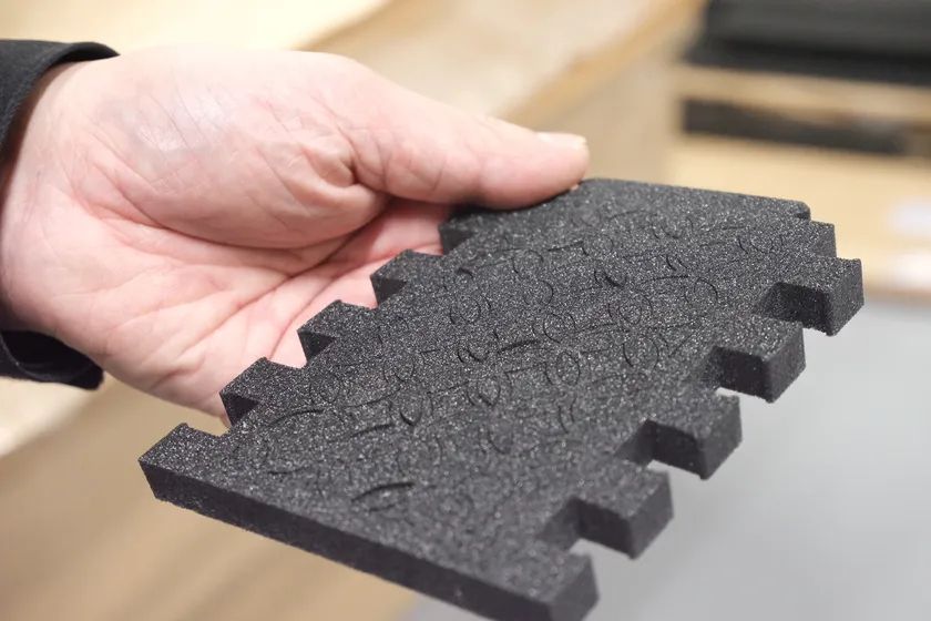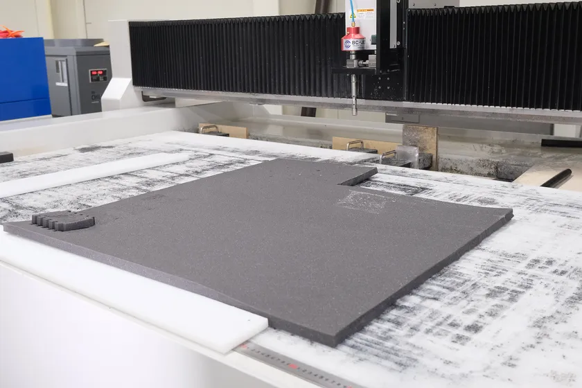 素材として採用したポリエチレンフォームは、刃物等では切削することができません。一般的なレーザーも溶けてしまいますので使用することができません。