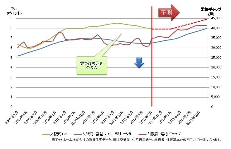 大阪府の需給ギャップは2012年後半から拡大傾向に転じます。2011年中頃からの被災者流入による下振れ圧力も弱まりつつあることから、2013年前半までは空室率TVIは横ばいで推移し、その後、需給ギャップの増加幅が広がる2013年の後半にかけて微増に転じると思われます。
