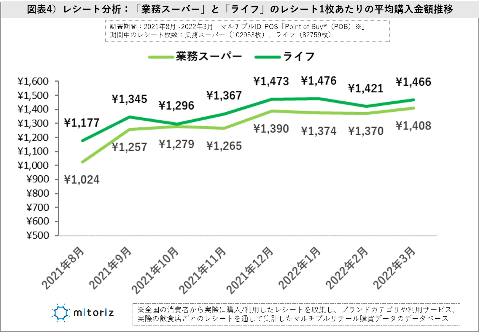 参考までに、POB会員から収集する「業務スーパー」と「ライフ」の購入レシートから、レシート1枚あたりの平均購入金額を分析すると、2021年8月の平均購入金額は、「業務スーパー(1,024円)」、「ライフ(1,177円)」に対し、2022年3月には、「業務スーパー(1,408円)」、「ライフ(1,466円)」となり、2社の平均購入金額の差は<153円→58円>にまで、迫っていることがレシートからわかりました。