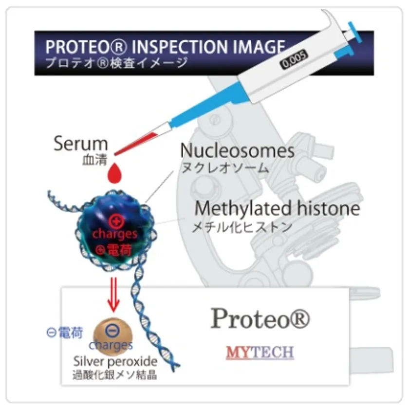 免疫プロテオ試験で利用する「プロテオ検査」とは、がん細胞が壊れることによってできるヌクレオソームの数を測定することで、血液1滴でステージ0(1mm以上)のがんリスクを判定することができる血液検査法、いわゆる、がんリキッドバイオプシーで、国内の有限会社マイテックが開発したものです。