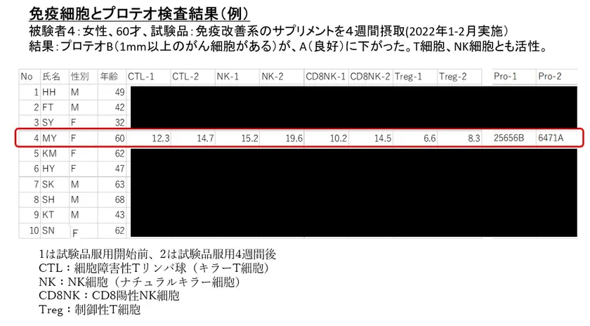 この中で、中高年女性1名が、ステージ0(1mm以上の)がんリスクのあるプロテオB判定がA判定に改善し、合わせて、NK細胞などの自然免疫が活性化していることが分かりました。つまり、この女性は「バンブーノイドの摂取により、NK細胞が活性化し、知らずにできていたステージ0のがんが抑制できた」ということが推察できるのです。