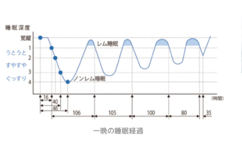 レム睡眠とノンレム睡眠、理想の睡眠状態は深い眠りから徐々に浅くなっていく波型をしています。このサイクルが記憶の整理・定着にとても大切になります。