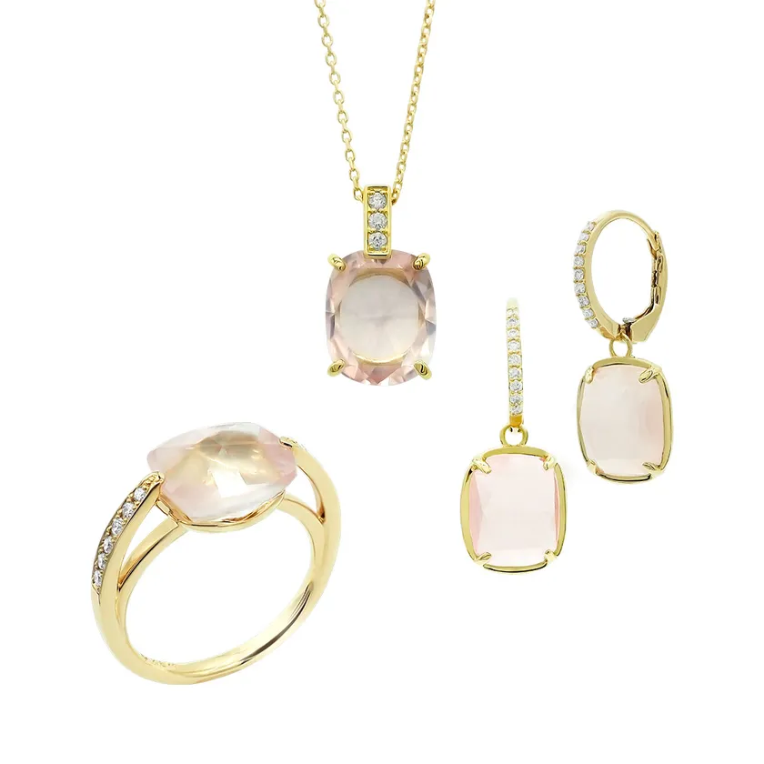 やわらかなピンクカラーが魅力のローズクオーツのジュエリーコレクション。正面はファセットカット、裏面はローズカットを施したオリジナルカットのクオーツは、奥行きのある独特なきらめきをお楽しみいただけます。ダイヤモンドを添え、幅広いシーンで活躍する大人のアイテムに仕上げました。やや丸みのあるスクエアフォルムが、ピンクカラーでも甘さ控えめな印象に。