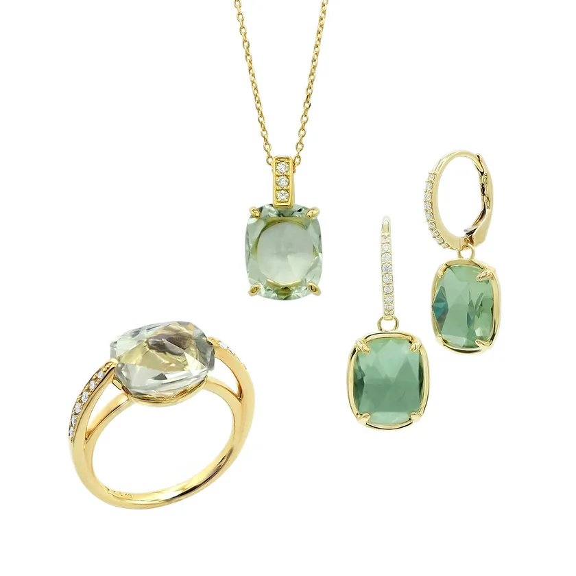 淡いカラーとみずみずしいきらめきが涼しげな印象を与える、グリーンクオーツ。オリジナルカットの魅力を引き出すため、それぞれ石留めにこだわりました。ネックレスは石の透明感を感じられるよう、正面から見たときにイエローゴールドが目立たないセッティングに。リングはあえて透かし模様が浮かび上がるようにデザインしています。裏表のない石留めを施したピアスは後ろから見ても石が綺麗に見え、アップスタイルにもぴったりです。