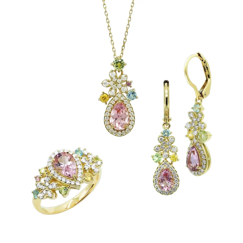 南国の鮮やかな情景からインスピレーションを受け、海や空、花やフルーツなどが織りなす美しい自然のすがたを描いたジュエリー。メインには厳選されたモルガナイトを使用。鮮やかで美しいピンクは希少性の高いカラーです。南国の花、プルメリアのモチーフや色とりどりのカラーストーンが夏の気分を盛り上げます。