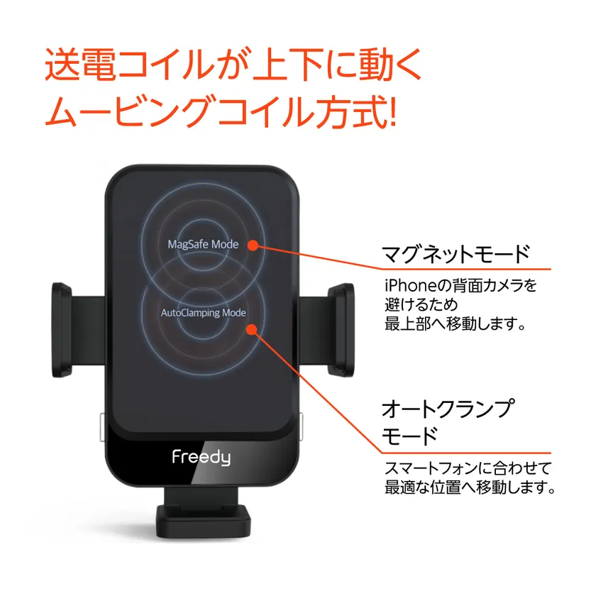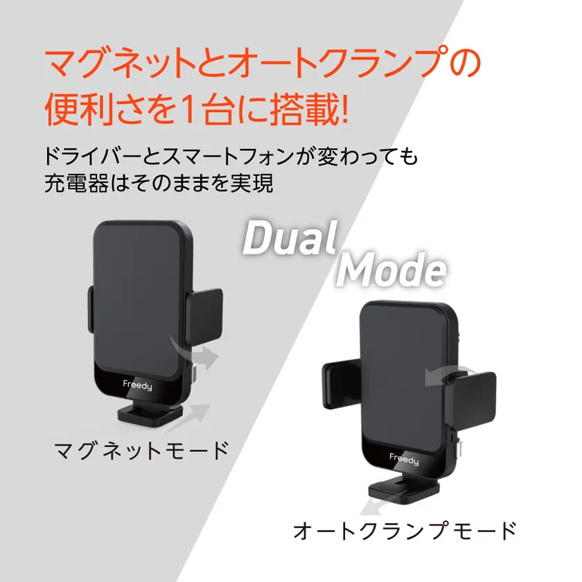 『Freedy デュアルモード カーマウントワイヤレスチャージャー』は、MagSafeに対応したiPhoneをマグネットでマウントする「マグネットモード」と、MagSafeに対応しないiPhoneやAndroidスマートフォンだけを検知してクランプする「オートクランプモード」の2つのマウントモードを切り換えて使用できるスマートなカーマウントワイヤレスチャージャーです。