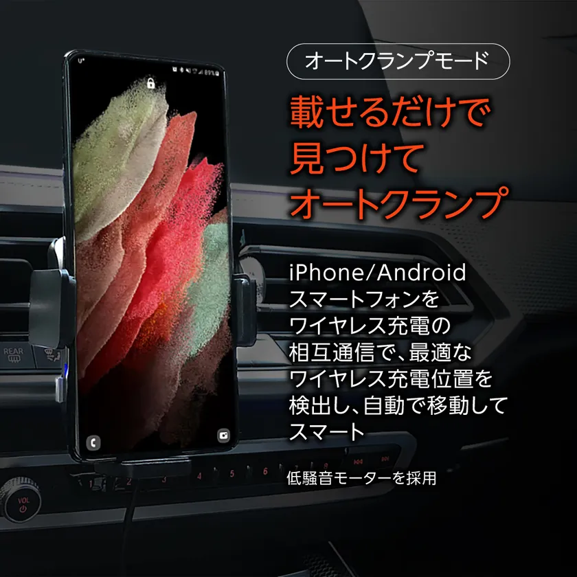 iPhoneでは最大7.5W、GalaxyなどのAndroidスマートフォンでは最大10Wまで対応する高速ワイヤレス充電をはじめ、あらゆる車両で使うために3種類のマウントアダプターの同梱、USB Type-Cケーブルによる給電、各種保護回路の搭載など各種機能も充実しているので安心してご使用いただけます。