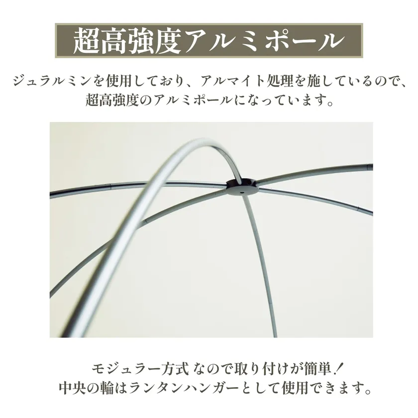 独自のポール構造は、体感したことのないほどの組み立てやすさと強度を実現しており、女性でも簡単に組み立てられます。フレームの中央はランタンハンガーとして使えます。急な天候の変化にも対応できるよう、ポールには、頑丈なアルミ素材(ジュラルミン)を使用しており、アルマイト加工を施すことで、高強度になっています。