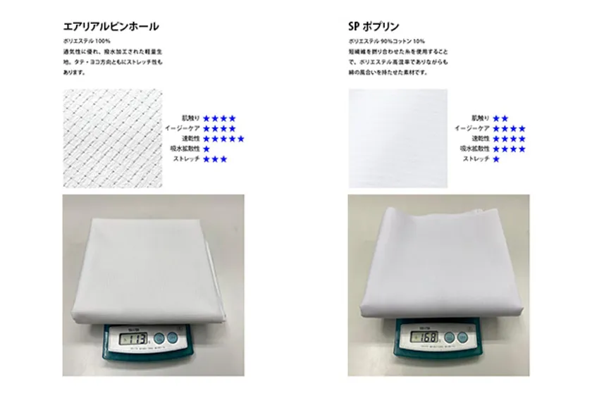 ※当社他ドクターコート使用素材「SPポプリン」の重量が168gに対し、当素材「エアリアルピンホール」の重量は113gと33%の軽量化(75cm x 155cmの生地の状態で測定)