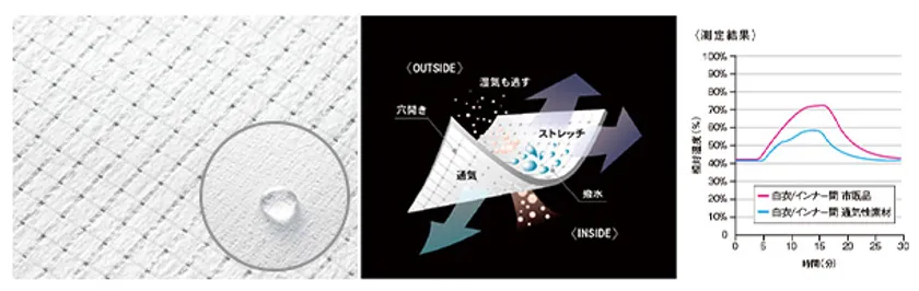 生地を織る段階で規則的に微細な「孔」を開けており、ここから衣服内にこもる熱や湿気を逃がす構造。撥水加工で汚れが付きにくく速乾性にも優れています。