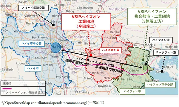 本物件が立地するVSIPハイズオン工業団地は、ベトナム・シンガポール両政府の支援の下で開発が進められており、設備等のハード面が充実していることに加え、質の高いカスタマーサービスを提供していること等が、高く評価されています。また、首都ハノイ市と北部最大の港湾都市ハイフォン市を結ぶ主要幹線道路沿いに位置しており、両都市へのアクセスに優れていることから、広域物流拠点として高い優位性を持っています。