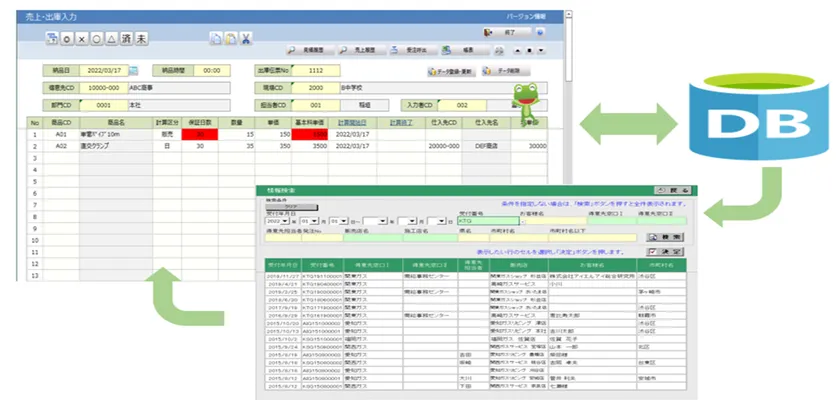 Excelをフロントエンドにし、データベース入出力プログラムを開発する。Excelシート上に伝票などの画面デザインを作成すると、データベースとフルアクセスプログラムが完成します。