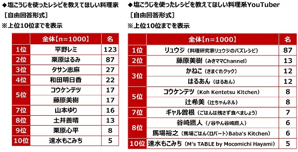 また、塩こうじを使ったレシピを教えてほしい料理系YouTuberを聞いたところ、「リュウジさん(料理研究家リュウジのバズレシピ)」(87名)がダントツとなりました。次いで、2位「藤原美樹さん(みきママChannel)」(13名)、3位「かねこさん(きまぐれクック)」「はるあんさん(はるあん)」(いずれも12名)、5位「コウケンテツさん(Koh Kentetsu Kitchen)」「辻希美さん(辻ちゃんネル)」(いずれも8名)となりました。