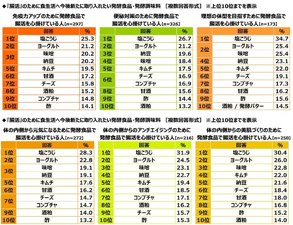 体の内側からの対策に注目してみると、体の内側から元気になるために発酵食品で腸活を心掛けている人・体の内側からのアンチエイジングのために発酵食品で腸活を心掛けている人・体の内側からの美肌づくりのために発酵食品で腸活を心掛けている人が選ぶ1位は、いずれも「塩こうじ」(順に28.3%、31.9%、30.4%)でした。健康や美容のために発酵食品で腸活をしている女性の多くが、食生活に取り入れたい次の腸活食品・腸活調味料として塩こうじをイメージし、その効果に期待を寄せているようです。
