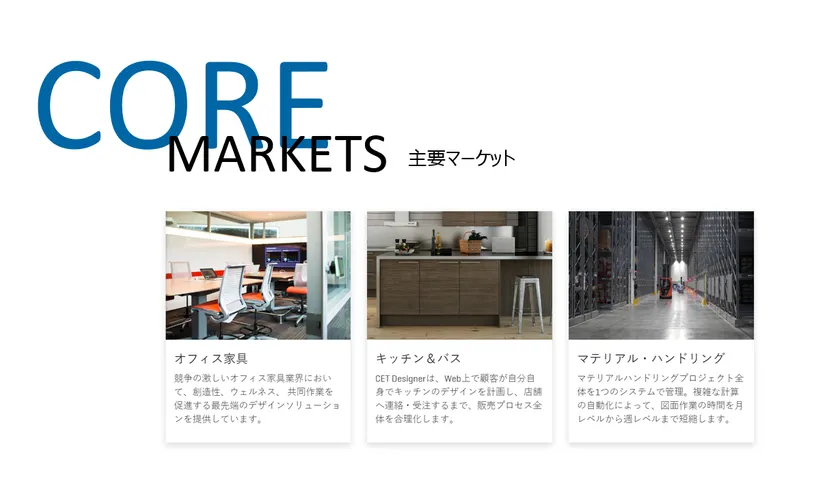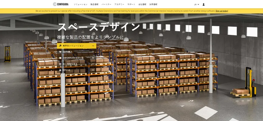 コンフィグラは日本市場に多くのメリットをもたらします。特に、パネルやキャビネット、ワークステーション、ラックやコンベヤなど複雑なユニット構成を持つ製品の視覚化、構成、配置構成を容易にします。これまで一緒に仕事をした多くの企業は、オフィスや物流倉庫の設計プロセスをスピードアップし、ユーザーが製品の構成や拾い出しミスを回避するソフトウェアの機能により、『CET』の助けを借りて提案~注文プロセスの生産性を向上させています。