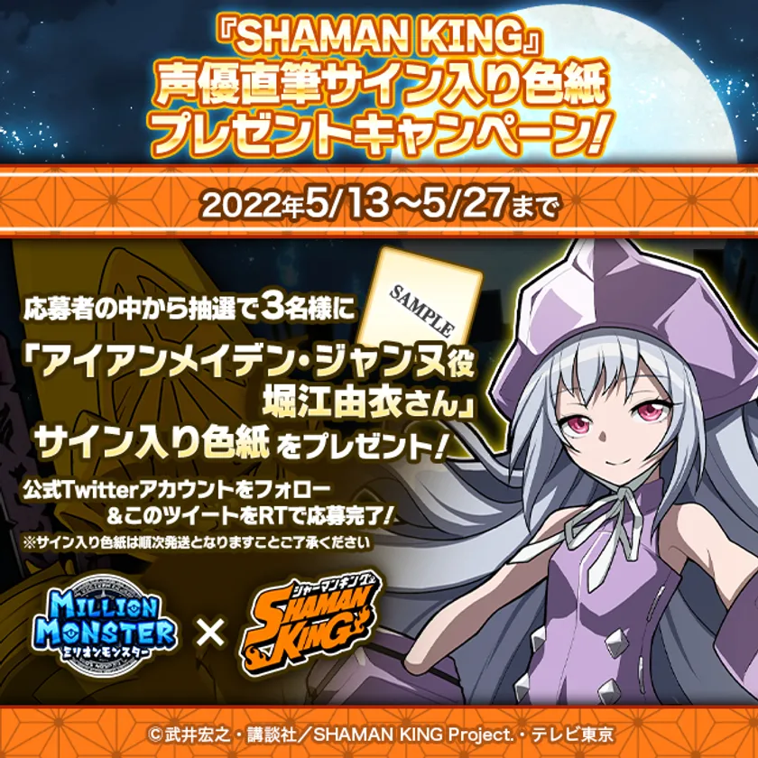 株式会社EX(所在地:東京都渋谷区、代表取締役:小野順季)は、iOS/Android端末用スマホRPG『ミリオンモンスター』において、人気TVアニメ『SHAMAN KING』とのコラボを5月13日(金)から5月27日(金)まで開催いたします。