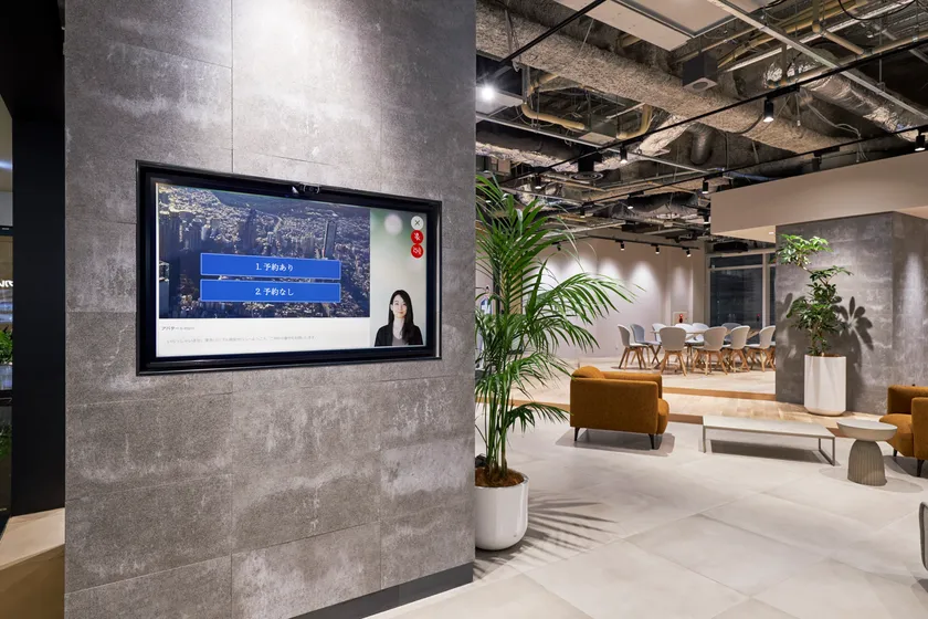 エントランスでは、ご来場いただいたお客様の受付窓口としてAIアバターがお迎えします。お客様と会話をしながらご予約の確認やコーナーへの誘導を行います。