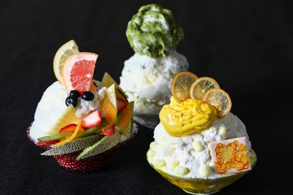 かき氷はそれぞれパフェのように味わいの異なる仕立ての層になっており、変化をつけることで最後まで飽きずにお召し上がりいただけます。異なる3種類をシェアして楽しんでいただくのもおすすめです。