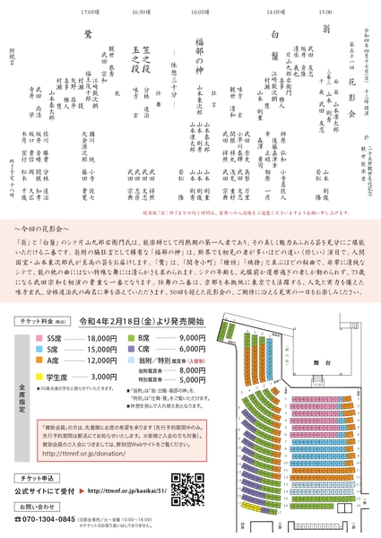 公益財団法人武田太加志記念能楽振興財団主催、『第51回花影会』が2022年4月17日 (日)に観世能楽堂(東京都中央区)にて上演されます。チケットはカンフェティ(運営:ロングランプランニング株式会社、東京都新宿区、代表取締役:榑松 大剛)にて発売中です。
