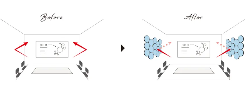 Beforeのように音は壁に当たると反射し、「声が聴き取りづらい」「ざわざわしている」等の不快感の元になりますが、OTTO R(オットー・アール)を貼ることで、壁に当たる音を吸収。反射を抑え、不快な響きを改善することができ、フロア内のざわつきやハウリング、昨今増えているWEB会議での反響音による聞き取りづらさ等、オフィスにおける音問題を解決します。