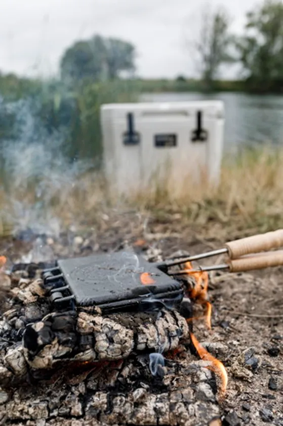 ワッフルメーカーと専用台がセットになった「回転式ワッフルメーカー」は、同ブランドから発売の焚き火台「Atago」の上に乗せることで、専用台に置きながらワッフルメーカーの焼き部分を回転させることができる便利グッズ。