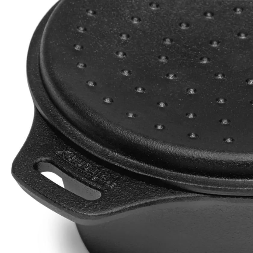 「小型ダッチオーブン」は、鍋の内径が約14cm、高さ8.6cm程度で持ち手を除く本体がすべて鋳鉄製ながら重さが2kgに満たない小鍋なので、ソロキャンプやご家庭で使うにもぴったりのサイズ感です。煮込み料理やスープ作り、そしてお菓子作りにも活躍します。ダッチオーブンは豊富な8サイズ展開。IH対応なので、ご自宅でもお使いいただけます。