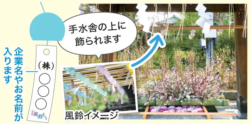ご支援いただいた方のお名前(企業名・個人名)を短冊に墨書きし、境内入口の門の手前にある「花手水」上の風鈴に七夕風鈴まつりの期間中、飾らせていただきます。(本殿前に設置する「奉納者御芳名看板」にも、期間中お名前を掲出させていただきます)また、お祭り終了後のおはらいの際に、お名前を読み上げさせていただきます。