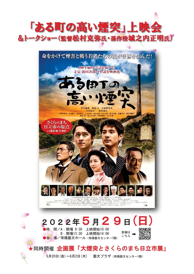 明治末から大正にかけて日立鉱山で発生した煙害問題。ふるさとの自然を守るために立ち上がった若者たちの姿を描いた新田次郎の「ある町の高い煙突」を、東日本大震災復興支援映画「天心」などで知られる松村克弥監督が映画化。先日ご逝去された俳優 渡辺裕之氏も本作に出演し、素晴らしい演技を披露されています。実話をもとにした感動の物語をお楽しみください。上映後には、松村監督と出演者の城之内正明氏のトークショーも開催いたします。