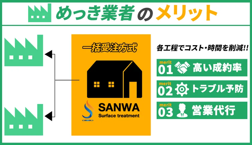 株式会社三和鍍金(本社:群馬県高崎市、代表取締役:武藤 篤、以下「当社」)はめっき産業の活発化を促す独自の一括受注方式を樹立し、2022年5月現在『めっきのショッピングモール』として自動車業界をはじめとする200社以上の加工メーカー様にご利用いただいております。当社は自社オウンドメディアによって直近1年間で新規問い合わせ件数が25倍に増加していますが、その中で自社内処理可能なめっき種だけでなく協力工場との連携によって、様々な案件のお引き合いをいただいております。加工メーカー様にとっては複数の処理を一括で三和鍍金に頼んでしまうことで煩わしい管理の手間が省け、人件費をはじめとしたコスト節約、または、時間の節約につながるというメリットがあります。協力工場であるめっき業者様にとっても、設備や扱っている薬品等に起因する個々の協力工場の得手不得手を当社が判断し、当該の協力工場様にマッチした案件を選択的に持ち込むことができるため、営業の人件費削減と高い成約率につながるというメリットがあります。この一括受注方式が適切なマッチングがされずに埋没してしまうはずであった案件を生産につなげ、めっき業界及びものづくり業界全体を活発化させる一端を担う可能性を秘めています。