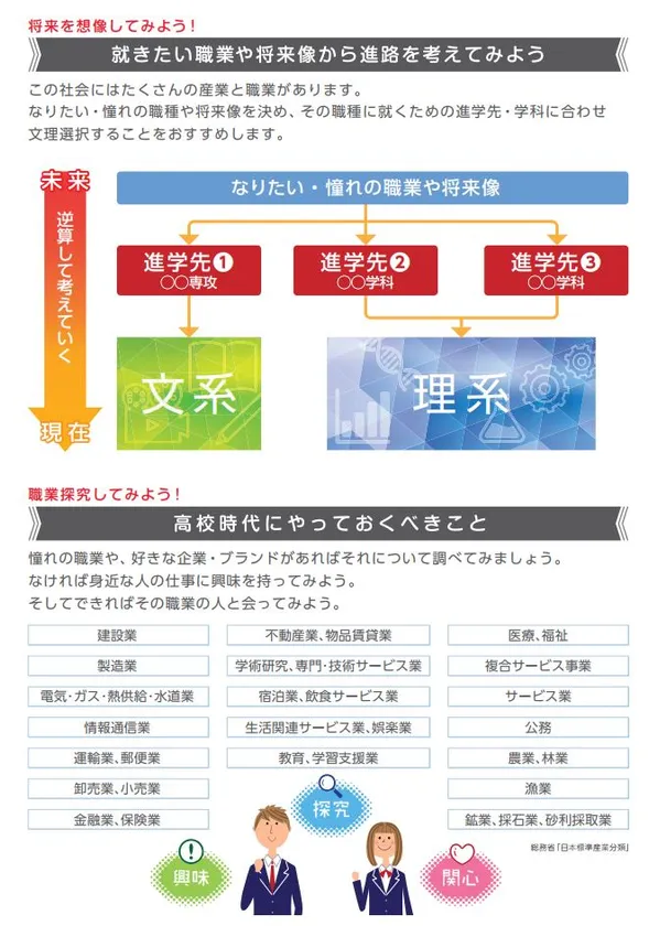 就きたい職業に就くために、卒業後の進学先選びに在学中の文理選択のキッカケに「進路探究ノート」を活用していただければ幸いです。