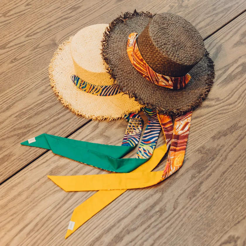 そんな彼らの活動に共感し、オーバーライドではクラウディが提供するテキスタイルを使ったコラボレーション商品を製作。これからの時期にぴったりなラフィアハットやヘアバンドなど、エネルギッシュな柄が印象的なアイテム3型が揃います。