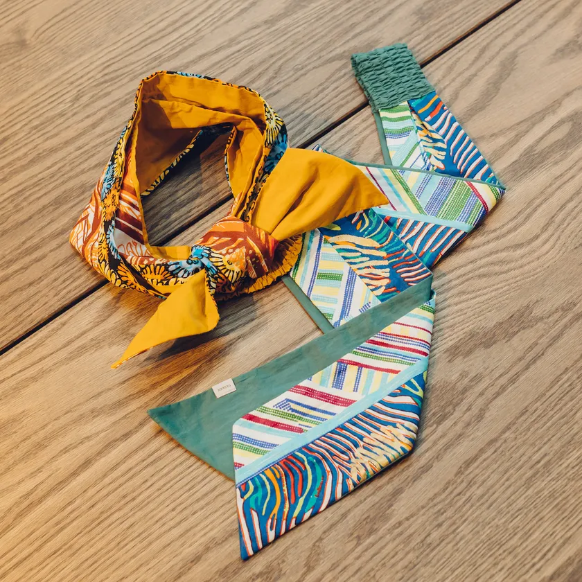 アフリカから届いた鮮やかなアフリカンファブリックを使用したフリーサイズのヘアバンド。ふたつの柄を組み合わせた贅沢なデザインです。後ろがゴムベルトになっているため程よいフィット感があります。色々な巻き方のアレンジが楽しめ、巻き方次第でゴム部分も隠れるので後ろ姿も美しく着用できます。