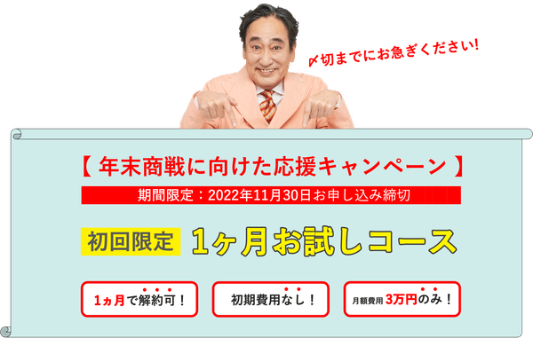 そんな店舗様には、「年末商戦に向けた応援キャンペーン ”1ヶ月お試しコース”」で、すべての課題を解決いたします。