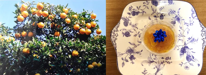 庭の夏みかんの樹(左)になった夏みかんでつくったマーマレード(右)