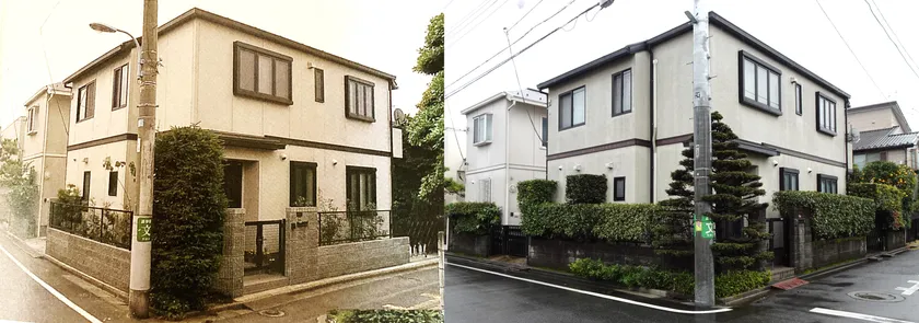 新築当時の生垣(左) 28年間手入れをし、成長した生垣(右)