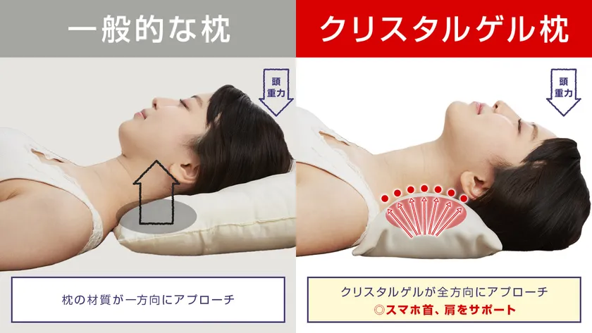 空気層を持たせ、より反発性を高めた「クリスタルゲル」が頸椎周りの筋肉である、僧帽筋(そうぼうきん)、板状筋(ばんじょうきん)、半棘筋肉(はんきょくきん)の3つの筋肉にアプローチします。