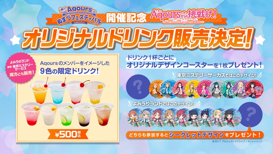 そして、ドリンク1杯ごとに限定オリジナルデザインコースターをプレゼントするキャンペーンも実施いたします。東京ミステリーサーカスでは『輝け!Aqoursぬまづフェスティバル』限定描き下ろしイラストを使った全9種を、よみうりランドでは法被を着たAqoursのデフォルメイラストを使用した全9種のコースターをランダムでプレゼント! さらに『輝け!Aqoursぬまづフェスティバル』と『Aqoursからの挑戦状!』両方の会場でコラボドリンクを購入した方には、シークレットデザインのコースターをそれぞれの会場ごとにお渡しします。